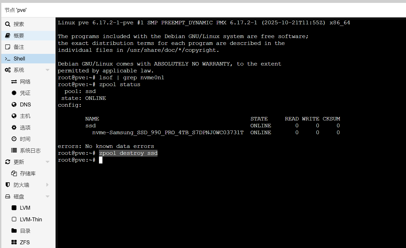 pve在执行磁盘擦除的时候报错:probing initialization failed: Device or resource busy 发布时间:2026-03-20 11:27:42 · 3 阅读 · 0 评论 完整的错误是类似这样的:error wiping '/dev/nvme0n1': wipefs: error: /dev/nvme0n1p1: probing initialization failed: Device or resource busy但是这个存储空间没有任何的虚拟机,这时就可以在shell中执行下面的命令zpool destroy ssd #ssd替换为存储空间名称这时候再执行擦除应该就正常了。