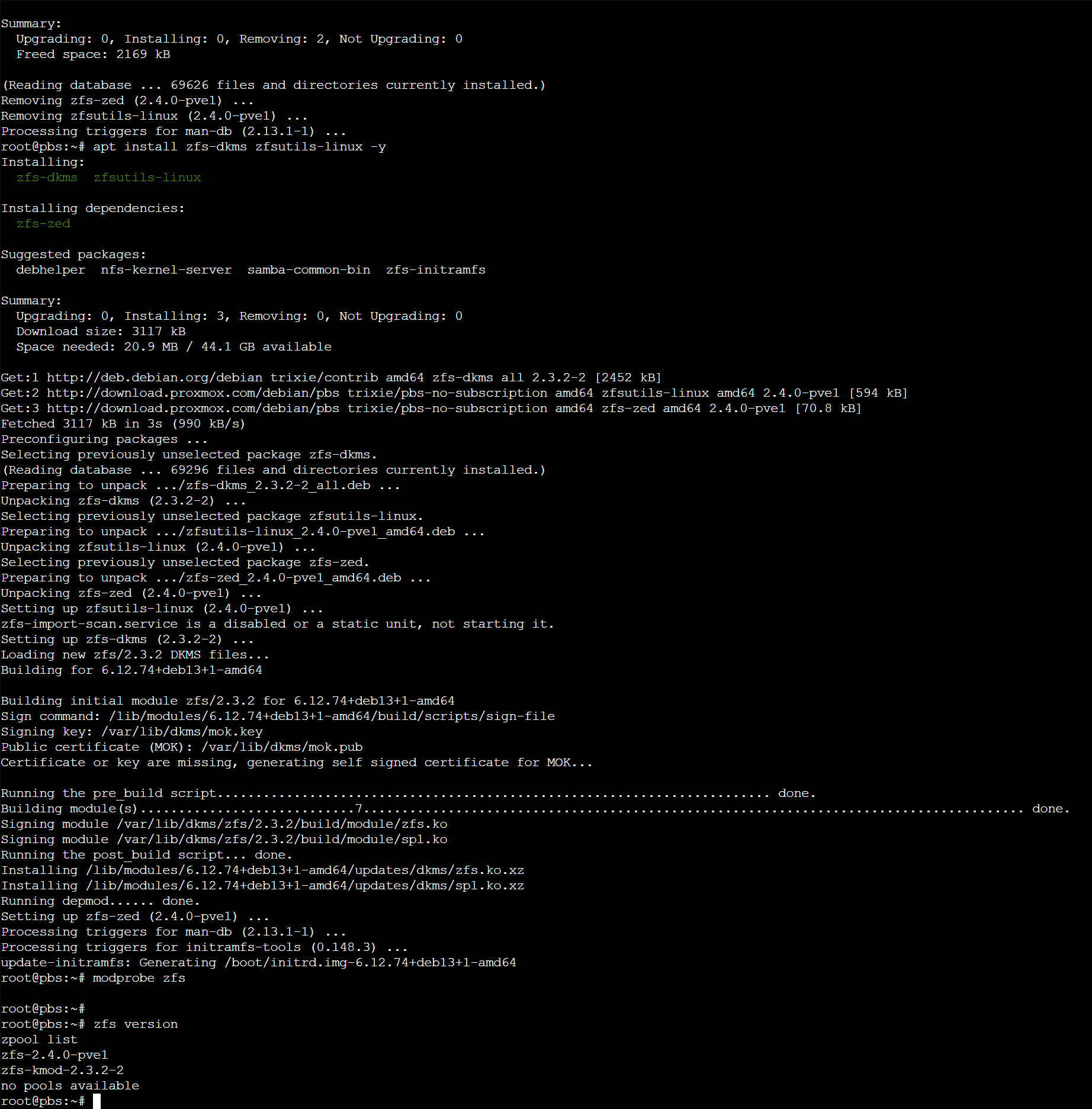 apt install build-essential dkms linux-headers-$(uname -r) -y #安装依赖 apt remove zfsutils-linux -y #重新安装 ZFS(强制用 Debian版本) apt install zfs-dkms zfsutils-linux -y #安装 Debian 原版:zfsutils modprobe zfs #加载模块 zfs version #验证 zpool list